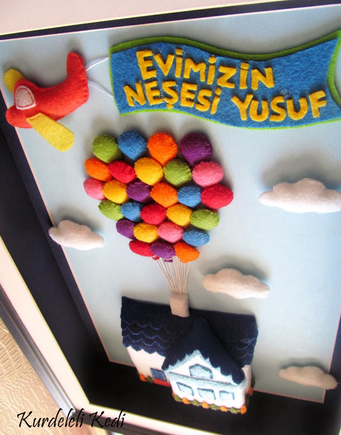 Buradaki hava balonlu kapı süsünü yaptığım Canan Hanım için bir de bu tablodan yaptım. Daha önce oğluma yaptığımı bu yazımda yayınlamıştım.. Bu seferkine bir de uçak ve yazı detayı ekledim..